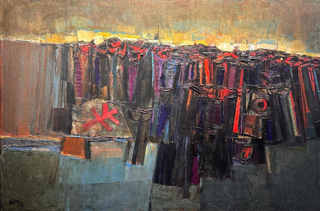 Gérard TROTTIER AND ROY KIYOOKA are slightly older and better known artists whose reputation is well established. The work of Gérald TROTTIER is rarely seen in large numbers, although at the end of 1963 he organized an exhibition in Ottawa where, for the first time, it was possible to appreciate the powerfully expressionistic and somewhat mystical scope of his painting. A convinced religious artist, he also works as a sculptor, muralist mosaic artist and in graphic arts. Dedicated to such diverse forms of artistic expression, one often sees forced to distance oneself from painting.