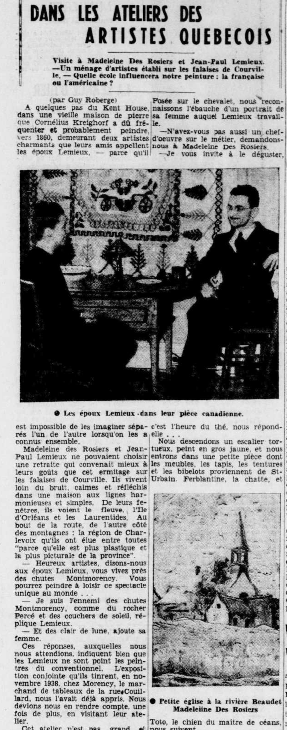 L’exposition a eu lieu du 15 au 22 novembre 1938, vernissage le 14 novembre à la Maison J.-A. Morency, sur la rue Couillard à Québec. Elle comportait 67 peintures, aquarelles et gouaches produites par Jean Paul Lemieux et Madeleine DesRosiers entre 1931 et 1938. Il s’agit-là de la première exposition du couple (la seule) qui vient de s’installer à Québec en 1937. Le tableau "Grange de M Tremblay est mentionné dans l'article.